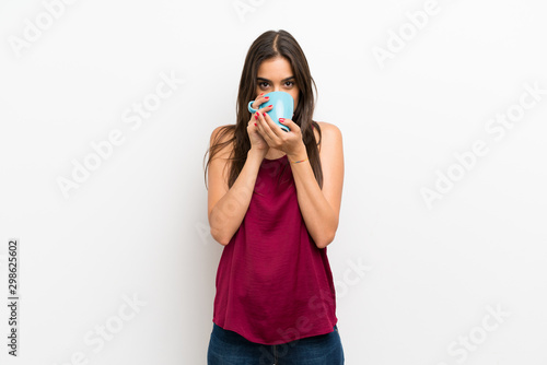 girl, woman, woman, people, person, lady, female, attractive, beauty, casual attire, young, adult, hispanic, caucasian, brunette, pretty, background, wall, isolated, white, beverage, cappuccino, chocolate, hot drink, cup, drink, food, holding, hot, mug, tea, cafes