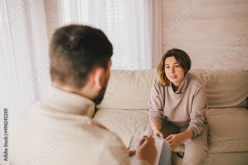 Young woman patient having consultation with psychotherapist in office. Medical mental help and support.