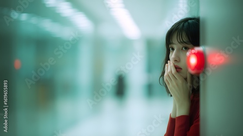 commercial, woman, young, peeking, corner, red, light, wall, indoor, hallway, blurred, background, soft focus, natural light, face, portrait, subtile, emotion, quiet, serene, calm, thoughtful, contemplative, cinematic, atmospheric, modern, interior, abstract, moody, people, business, office, person, beauty, smile, fashion, model, city, shopping, businesswoman, lifestyle, hair, smiling, student, brunette, window, 1
