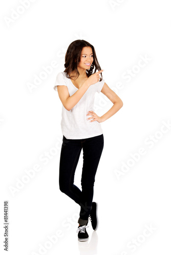 cheerful, woman, pointing, aside, african, isolated, attractive, young, finger, standing, showing, girl, casual attire, people, happy, advertisement, smiling, beauty, brunette, white, female, smile, beautiful, background, marketing, empty, promotion, copy space, confident, happiness, adult, studio, 1, friendly, point, full-length, student, white background, joyful, natural