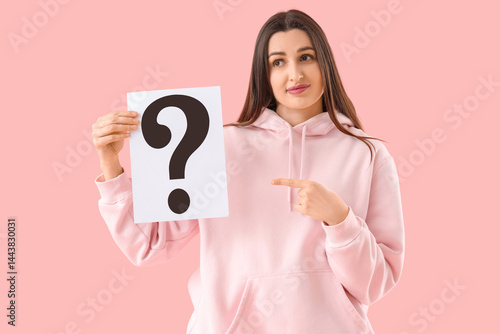Young woman pointing at paper question mark on pink background