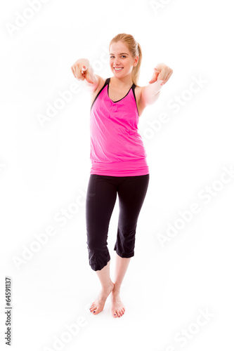 lifestyle, confidence, arms outstretched, happiness, vertical, studio shot, pointing finger, front view, beautiful, top, communication, adults only, woman, young adult, barefoot beach, content, portrait, tank top, enjoyment, one person, cheerful, human hand, color image, toothy smile, satisfaction, pointing, smiling, showing, indexed, direction, casual clothes, human finger, photo, full-length, white background, gesticulate, cut-out, missy, caucasian appearance, standing