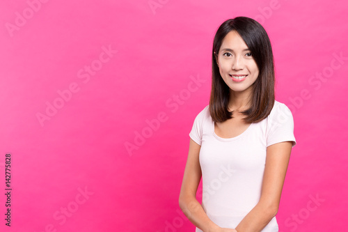 woman, girl, female, people, japanese, korean, chinese, asia, asian, red, bright, pink, background, over, 1, portrait, smile, confident, smart, successful, happy, friendly, racked, cheerful, positive, fresh, content, satisfied, proud, dependability, student, university, homemaker, tee
