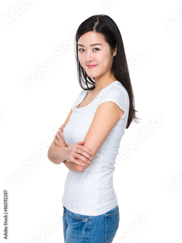 woman, lady, girl, female, japanese, korean, chinese, asia, asian, china, taiwanese, tee, shirt, t-shirt, clean, casual attire, wear, mock, up, plain, blank, cross, hand, folded, arm, cheerful, enthusiastic, energetic, confident, pose, kindly, modern, clever, great, pleasure, isolated, white, background, people, person, portrait, 1, young, adult, mature, gorgeous, elegance, smile, happy