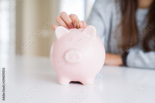 woman, background, bank, bright, brunette, business, businessman, cash, closeup, coin, deposit, earning, economy, euro, finance, financier, finger, girl, hand, hand, hispanic, holding, home, house, indoor, insurance, invest, investment, money, object, pig, baby pig, money box, pink, portrait, putting, retirement, safe, save, saving, savings, success, table, teenage, watch, white, window, young