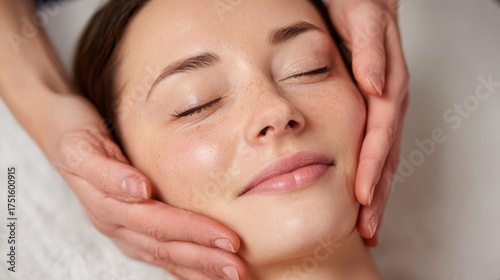 Young woman receiving a calming facial massage at a spa for stress relief