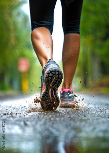 Young woman running in rainy weather, water and mud splashes as her feet hits the ground, low angle closeup detail from behind, only legs with shoes visible. Generative AI