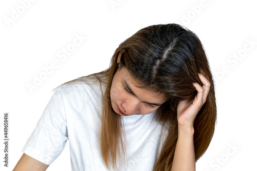 adult, ageing, ageing, attractive, beautiful, beauty, brunette, care, caucasian, concept, dandruff, down, dye, dyed, expression, female, girl, grey, grey, hair, hairline, coiffure, hand, head, cephalalgia, health, horrified, human, isolated, looking, loss, medicals, model, old, person, portrait, problem, root, scalp, scratch, serious, shampoo, sick, stress, stressed, through, treatment, white, woman