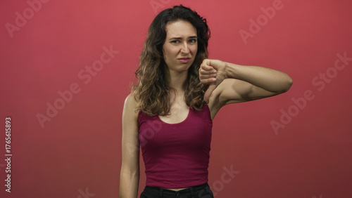 woman, arm, grimace, studio, hispanic, young, pink, red, female, colourful, dissatisfaction, discontent, displeasure, frustration, unhappiness, disapproval, annoyance, rancor, irritation, grievance, thumb, denial, gesture, grimacing, youthful, lady, woman, arm, limb, hand, face, expression, scowl, contempt, displeased, tension, reaction, criticism, judgement, evaluation, opposing, signal, signs, indoor, feedback, fuchsia, magenta, coral