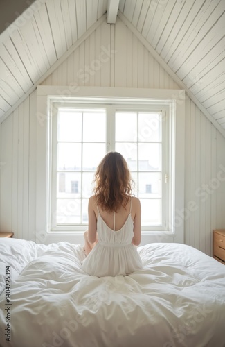 Young woman sits on bed in white dress. Bright loft bedroom interior. Sunlight from window, cozy home. Morning, leisure, vacation, holiday, comfort, relaxation, peaceful mood.