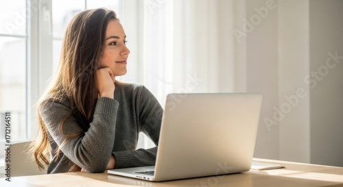 Young Woman Sitting at Desk with Laptop in Bright Office Natural Light