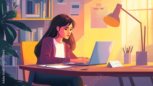 Young woman sitting at the table and working from home.