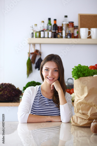kitchen, woman, eating, apron, crossed, arm, menu, blank, adult, casual attire, people, 1, female, shopping, grocery, paper, home, house, bag, indoor, food, counter, pot, happiness, plate, vegetable, smile, modern, culinary, lifestyle, healthy, young, sitting, interior, person, oven, cheerful, beautiful, domestic, happy