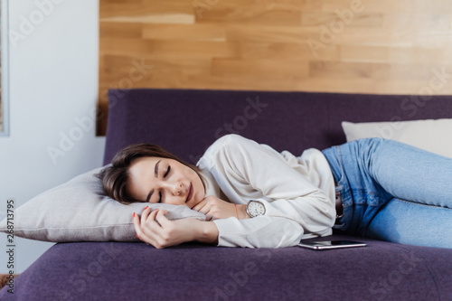 background, woman, business, person, girl, house, couch, home, people, female, leisure, lifestyle, resting, young, sofa, 20s, sleepy, asleep, caucasian, horizontal, indoor, napping, 1, relaxation, relaxed, sleeping, nap, full, white, casual attire, cosy, cushion, domestic, length, rug, woman, adult, life, lying, portrait, sleep, pillow, head, beauty, bed, morning, brunette, attractive, beautiful, bedchamber
