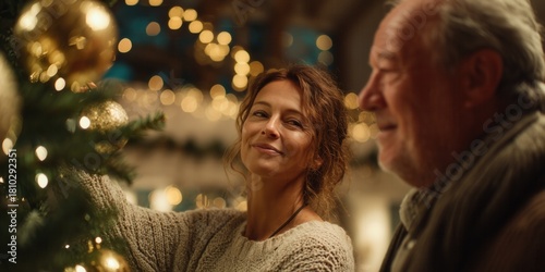 Young woman smiles at her partner while decorating a glowing Christmas tree together. Warm festive atmosphere, intimacy, and joy in golden holiday lights.