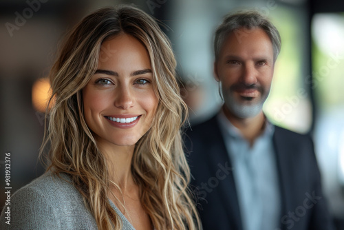 woman, smiling, portrait, blonde hair, confident, professional, business, success, head shot, casual attire, man, suit, background, out of focus, female, missy, white teeth, happy, positive, work, office, businesswoman, caucasian