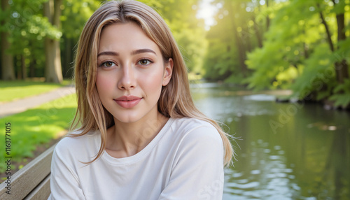 smiling, woman, t-shirt, river, spring, nature, peaceful, sunlight, greenery, serene, calmness, portrait, young, outdoors, soft, daylight, foliage, bench, water, beauty, joy, positive, happiness, casual attire, t-shirt, sitting, calm, shadow, reflections, no people, wood, environment, serenity, lifestyle, enjoying, relaxation, freshness, 1, harmony, young adult, casual clothes, vitality, youth, facial expression, natural beauty