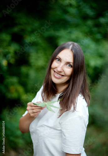 Young woman smiling outdoor. Beautiful brunete girl resting on park or garden green background. Free happy woman at summertime. Freedom happiness carefree happy people concept