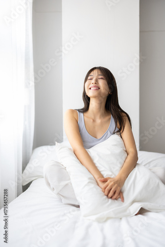 smile, pillow, hug, woman, bed, cosy, comfort, morning, happy, soft, bedding, wellness, warmth, beauty, white, lifestyle, peaceful, gentle, relax, window, sleep, healthy, young, rest, indoor, face, emotional, cute, joy, freshness, comforter, wake up, calm, home, natural, girl, calmness, love, bedchamber, light, positivity, affectionate, mood, morning light, tenderness, serenity, expression, person