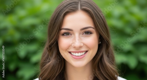 young, woman, smiling, happy, portrait, head shot, face, beauty, female, natural, light, green, foliage, background, hair, eye, teeth, confident, friendly, pleasant, person, 1, people, caucasian
