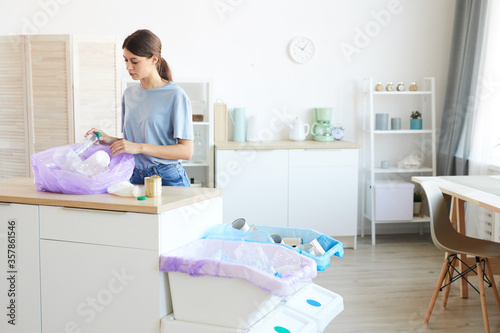 Young woman standing near the kitchen table and putting the garbage into the packet in the kitchen at home