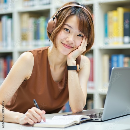 Young woman studies in library, wearing headphones, using laptop and taking notes. Serene and focused learning environment.