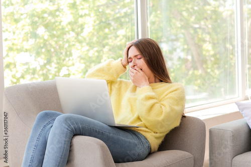Young woman suffering from sleep deprivation with laptop at home