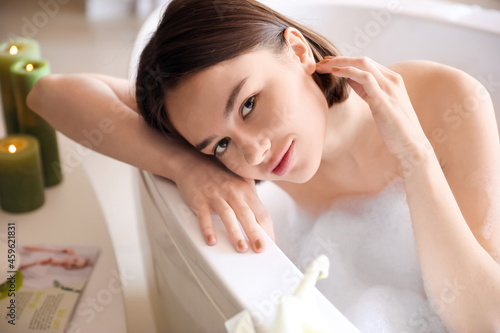 Young woman taking relaxing bath at home, closeup