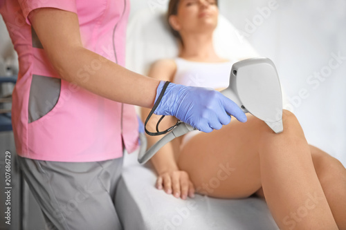 Young woman undergoing laser epilation procedure in beauty salon