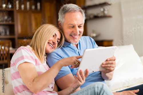 woman, man, couple, male, female, family, wife, husband, interior, people, person, tablet, computer, network, reading, news, app, software, application, electronic mail, e-business, cyberspace, web, wireless, wi-fi, home, house, apartment, luxury, wealth, leather, white, sofa, couch, pink, relax, relaxing, smile, smiling, happy, lying, serenity, happiness, lady, social, concept, hardware, modern, big, pad