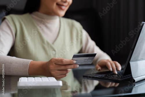 Young woman using credit card and tablet for buying online shopping at home , payment, buying and online shopping concept