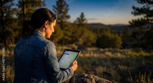 Young woman using digital tablet outdoors during golden hour sunset in mountain wilderness for remote work and technology connection in nature.