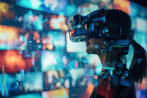 Young woman using glasses of virtual reality on colorful control room background. Monitoring and control using with VR headset, virtual reality, future technology concept.