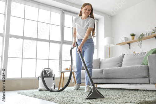 Young woman vacuuming carpet at home