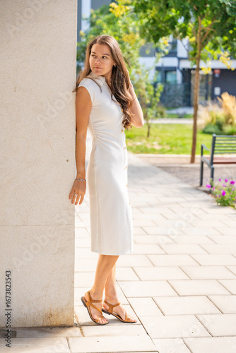 Young woman wearing a white midi dress walking outdoors in Old Money style. Concept of timeless fashion, graceful femininity and understated elegance in modern lifestyle.