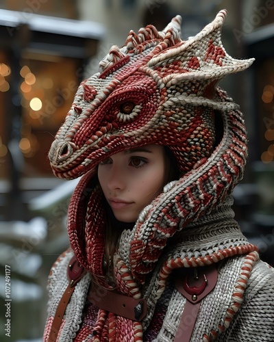 Young woman wearing elaborate fantasy dragon costume with intricate red and silver scaled headdress and armor, perfect for cosplay, gaming or fantasy art concepts.