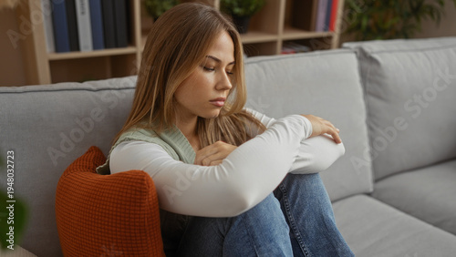woman, couch, hugs, building, female, young, adult, blond, caucasian, indoor, contemplation, introspection, meditation, rumination, solitude, isolation, serenity, calmness, quietness, peace, sofa, loveseat, divan, sweater, jean, hugs, clinging, cuddle, holding, pensive, home, house, living room, apartment, interior, sitting, relaxed, calmness, stillness, rest, composure, poise, indoor, grown-up, mature, youth, denim, thoughtfulness