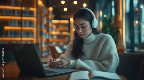 Young woman wearing headphones and a beanie studying with a laptop and notebook in a cozy library. Education and focus concept
