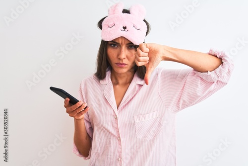 Young woman wearing sleep mask pajama using smartphone over isolated white background with angry face, negative sign showing dislike with thumbs down, rejection concept