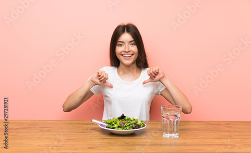 salad, food, healthy, fresh, green, lettuce, meal, vegetarian, nourishment, vegetable, leaf, diet, plate, epicure, girl, woman, woman, people, person, female, pretty, young, caucasian, pink, to sit, table, himself, point, vain, arrogant, conceit, proud, gesture, confident, happy, successful, success, expression, victory, fun, positive, satisfaction, agreements