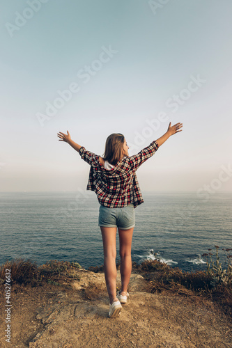 young, woman, arm, outstretched, standing, clear, sky, copy space, 1, people, travel, adult, journey, female, outdoors, casual attire, looking, carefree, freedom, plaid, shirt, checked, mindfulness, satisfaction, leisure, spain, exploration, basque country, coast, caucasian, vacation, lifestyle, nature, water, sea, scenic, short, cliff, landscape, escapism