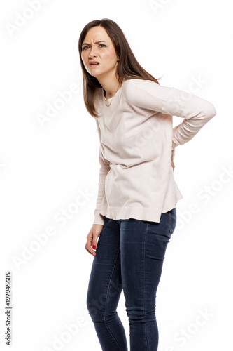 pain, back, woman, female, backache, ache, health, young, painful, lower, injury, spine, person, girl, isolated, adult, bruised, body, physical, cramp, lumbar, medicine, concept, white background