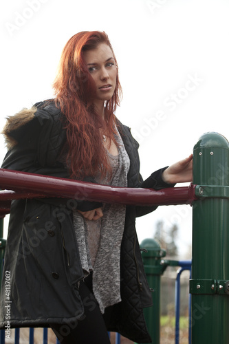 young, woman, 20, something, adult, female, red, green, hair, eye, blue, pretty, attractive, beautiful, smile, smiling, coat, winter, happy, content, cheerful, auburn, playground, equipment