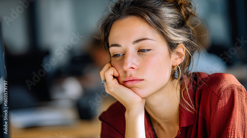 Young woman with bored expression sitting desk office environment resting her face her hand looking away with tired and uninterested look casual style wearing earrings brown hair natural makeup