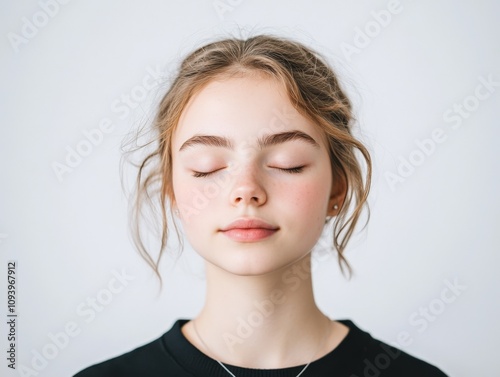 portrait, serenity, calm, beauty, young, woman, eyes closed, natural, peaceful, relaxation, skin, hair, expression, minimalist, studio, emotion, youth, wellness, meditation