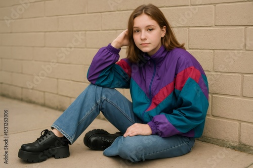 90s, teenage, girl, fashion, retro, vintage, clothing, style, trendy, wall, sitting, brick, urban, youth, generation, nostalgic, colourful, jacket, shoe, platform, jean, casual attire, portrait, lifestyle, grunge, alternative, aesthetic, cool, expression, individuality, street, background, model
