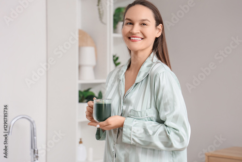 Young woman with cup of spirulina drink in bathroom
