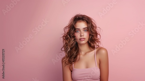 woman, curly, hair, pink, tank, top, beauty, portrait, studio, background, fashion, young, female, model, style, coiffure, curl, wavy, elegance, attractive, face, skin, health, care, adult, femininity, individual, unique, look, expression, eye, make-up, soft, gentle, minimalist, texture, simple, modern, cosmetic, poster, banner, smooth, detail, wellness, person, people, glamour