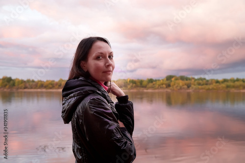 Young woman with dark hair in a black leather jacket on the river Bank at sunset in the autumn, spring or summer evening