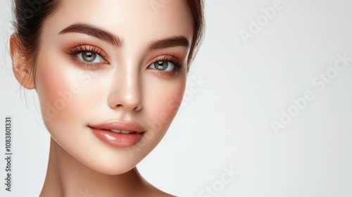 Young woman with flawless skin and captivating gaze showcasing natural beauty and radiant makeup in a clean, minimalistic setting perfect for beauty and skincare themes